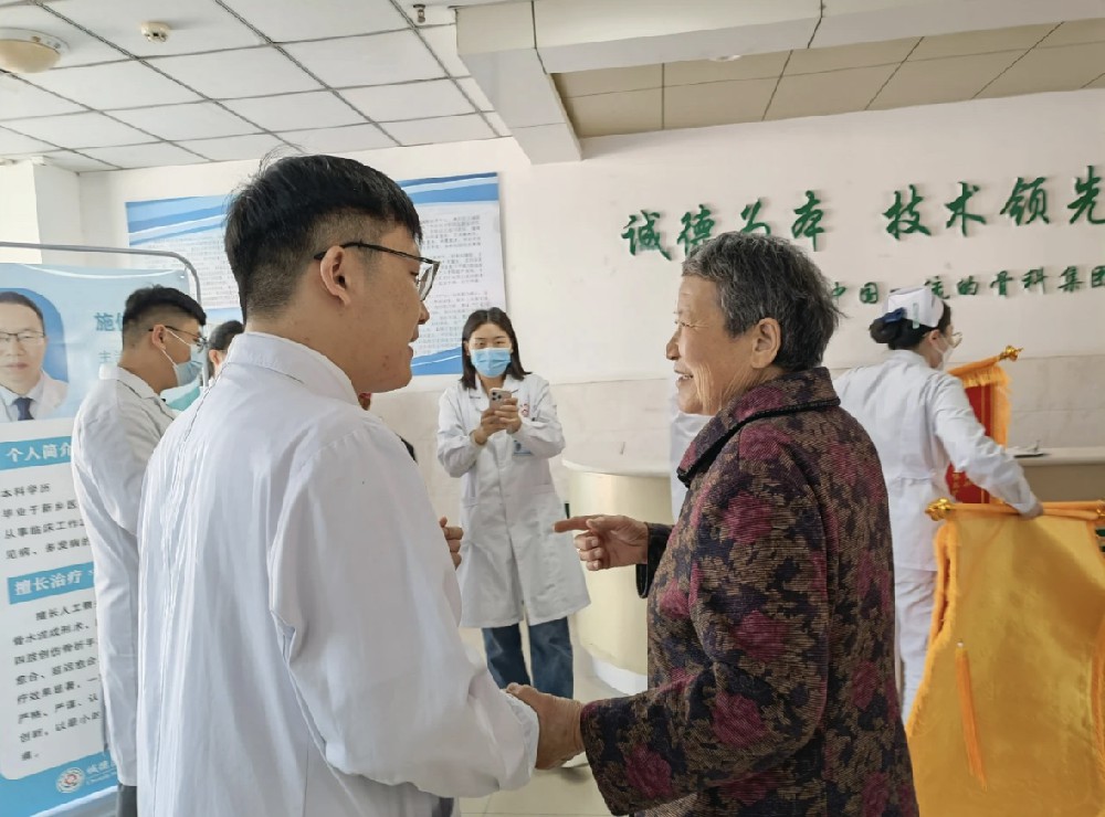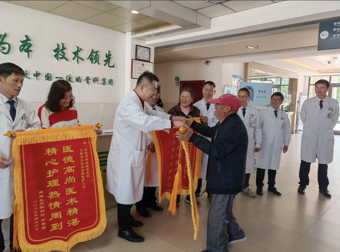 患者袁某某,于20229月突發(fā)腦梗死導(dǎo)致右側(cè)肢體偏癱,202211月底為求康復(fù)治療,到滕州誠(chéng)德骨科醫(yī)院以右側(cè)肢體偏癱收入院。入院以來(lái)給予積極控制原發(fā)病,降糖,營(yíng)養(yǎng)腦神經(jīng),偏癱肢體綜合康復(fù)治療后,現(xiàn)患者可進(jìn)行簡(jiǎn)單日常言語(yǔ)交流,右上肢肌力1級(jí),右下肢肌力2級(jí),坐位平衡3級(jí),站立平衡1級(jí),能夠在治療師協(xié)助下完成床和輪椅的轉(zhuǎn)換、助行器站立。患者家屬為感謝病情逐漸的好轉(zhuǎn)贈(zèng)送康復(fù)科錦旗三枚。