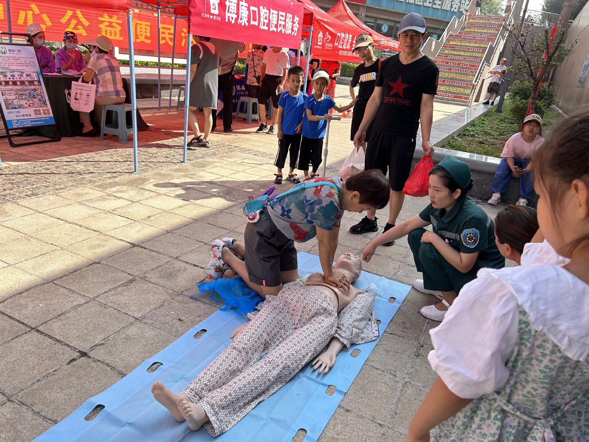 活動現場,醫(yī)務人員耐心細致的為群眾進行血糖、血壓、骨科類等檢查,詳細解答群眾咨詢,并發(fā)放了急救健康知識科普手冊。同時,圍繞“數字賦能 救在身邊”這一主題,醫(yī)院醫(yī)護人員現場演示了心肺復蘇術和海姆立克急救法,并引導在場群眾實地操作模擬人進行練習,有效加深了在場群眾對急救理論知識的理解運用。