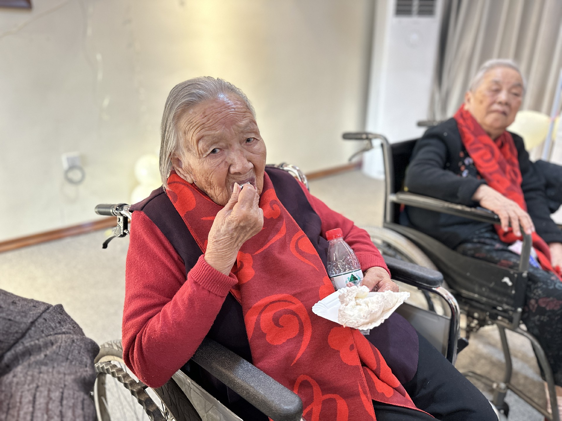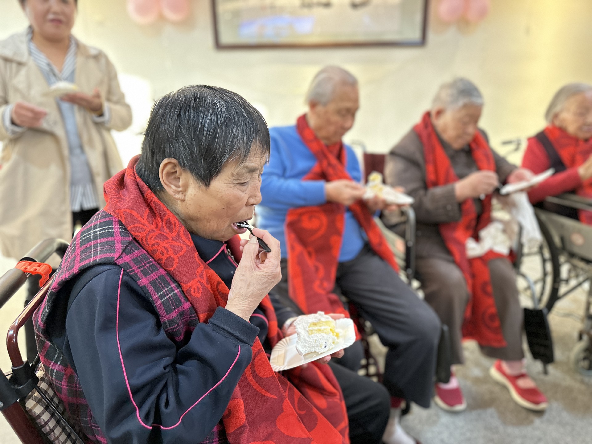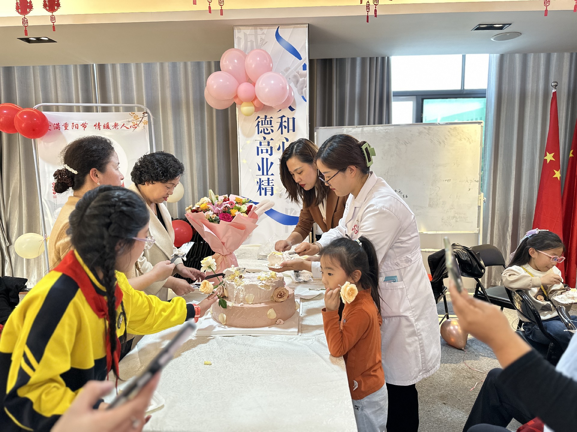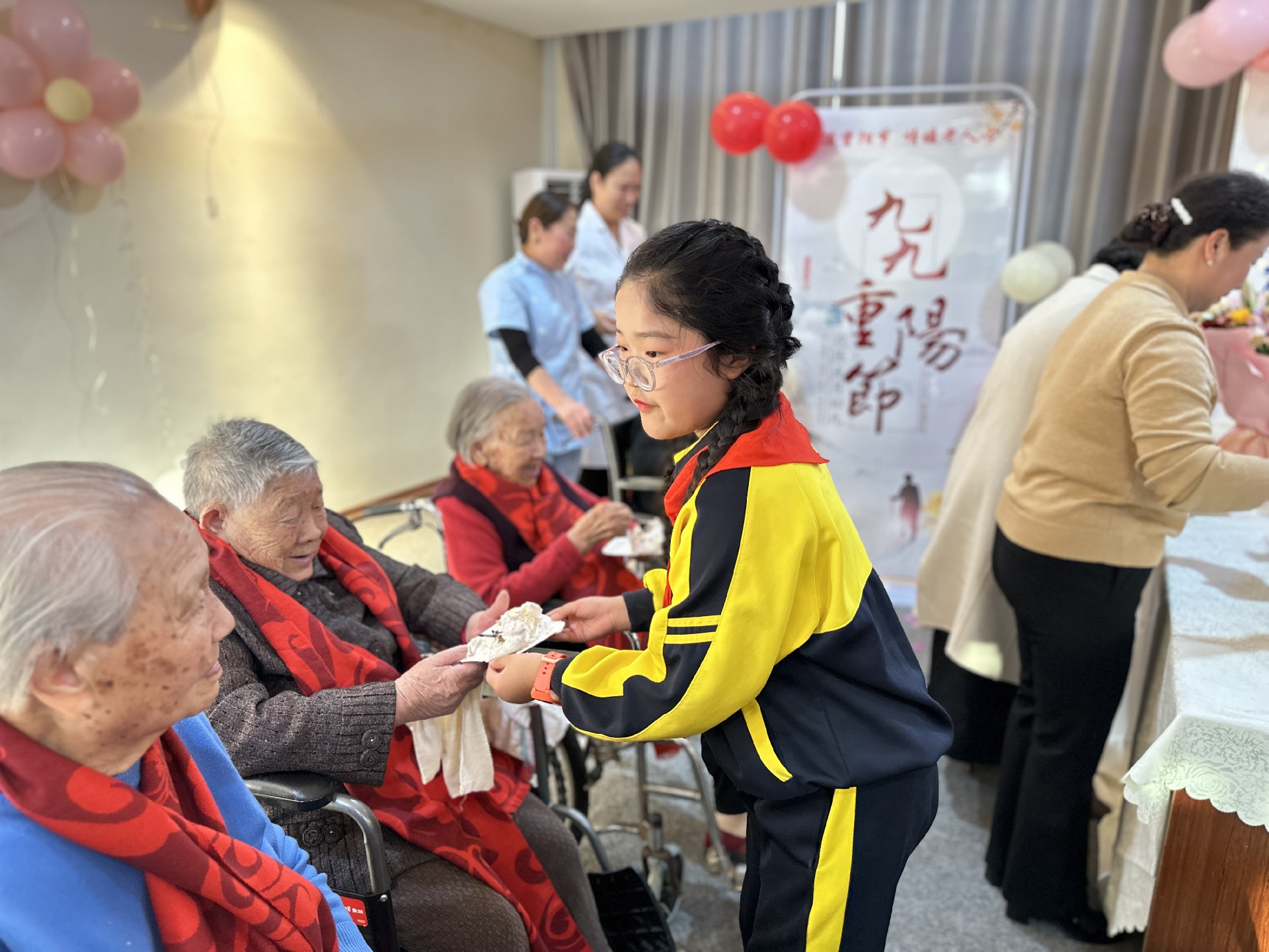 文藝表演結(jié)束后,與會(huì)人員向老人們獻(xiàn)上了節(jié)日蛋糕,學(xué)生們紛紛用自己的行動(dòng)敬老愛(ài)老。